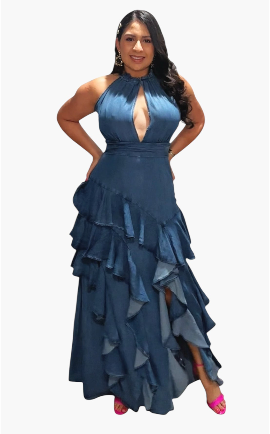 RUFFLE DETAIL HALTER NECK MAXI DRESS. LIGHT DENIM FABRIC.
