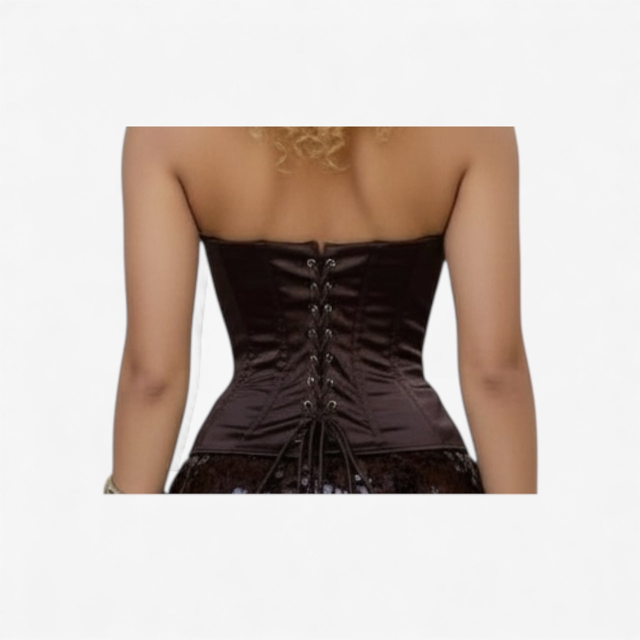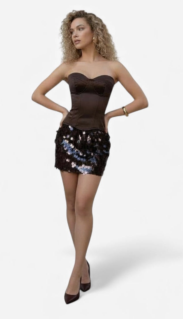 A strapless, satin, structured corset-style top in a rich chocolate brown color. The bodice features defined cup seams and paneling that enhance structure and shape. Paired with a mini skirt adorned with large, reflective sequins in dark brown and iridescent tones.